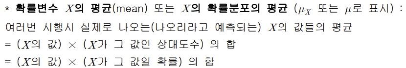 따라서 X의 평균(기댓값)은 (X의 값) * ( X가 그 값일 확률)의 합으로 계산한다.