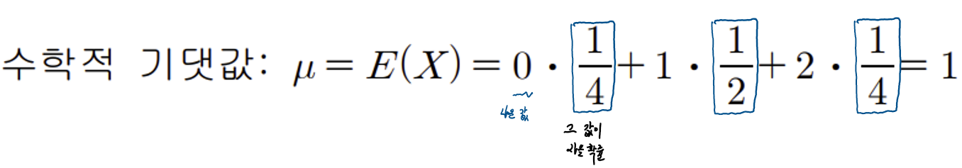 뜻은 두개의 동전을 계속 던진다고 하였을때, 앞면이 1개 정도 나올 것이라고 기대된다는 것을 의미한다.