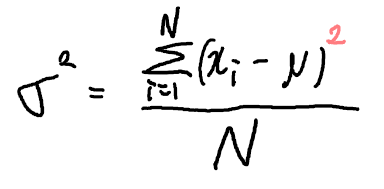 앞서 계산할때, 결과값이 0이 나온 이유를 직관적으로 생각해본다면 평균보다 높은 자료가 있을것이고 평균보다 낮은 자료가 있을것이다. 따라서 자료에서 평균값을 뺀 결과는 (+) 혹은 (-)가 나오기때문에 결과들을 모두 더한다면 상쇄되었기 때문에 0이란 결과가 나온 것이다. 따라서 (-)의 값을 (+)의 값으로 만듦으로써 의미를 부여하기위해 자료가 평균에서 떨어진 정도를 제곱해보자 . 이때 분산의 개념이 등장한다.