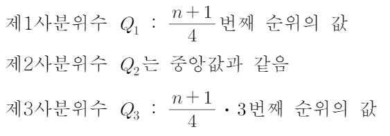 사분위수: 크기 순서에 따라 나열했을 경우, 4등분을 하면 3개의 구역으로 나눌수 있는데,