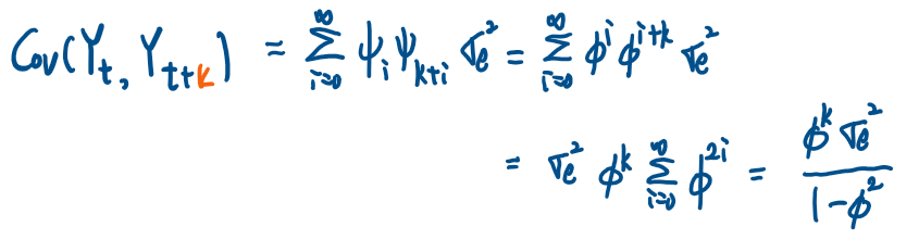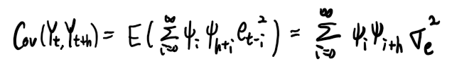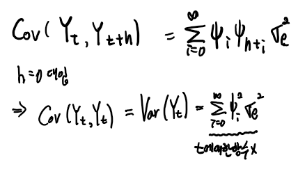 즉 공분산의 식을 빨간색 항들의 무한합으로 표현할 수 있으므로 다음과 같이 표현할 수 있다.