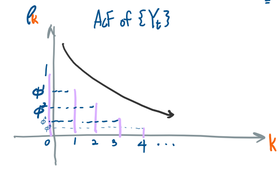 해당 모형이 만들어낸 {Yt}가 정상성 조건을 가지기 위해서는 Φ의 절댓값이 1보다 작아야함을 알 수 있다.