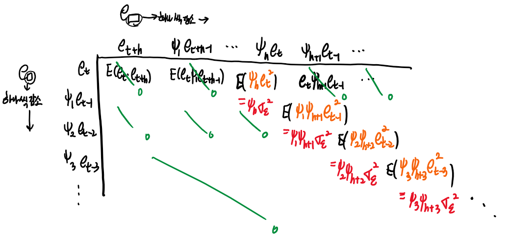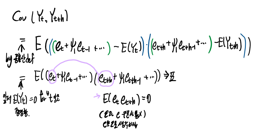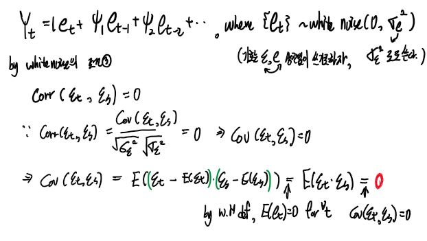 (백색잡음의 정의와 공분산의 정의 식을 다시 생각해보고 , 해당 모형의 상황을 생각하면 아래와 같은 식을 도출할 수 있습니다.)
