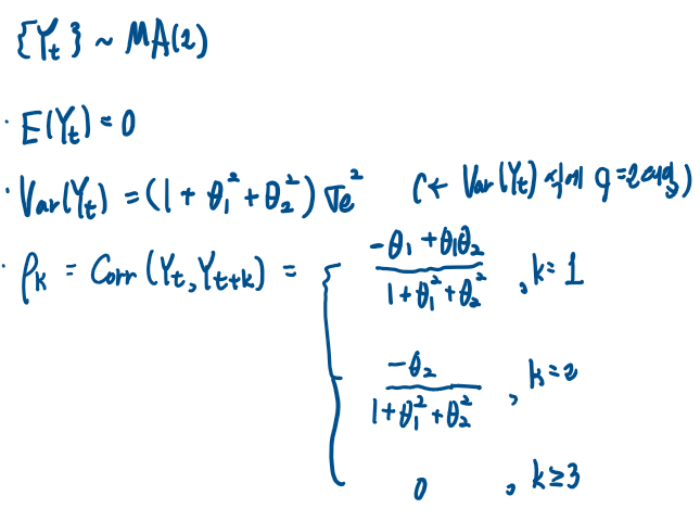 MA(q) 의 이론적으로 도출된 기대값, 상관계수식에 따라서 {Yt} ~MA(2)에서 Yt의 기대값, 분산, 상관계수를 다음과 같이 쓸수 있다.