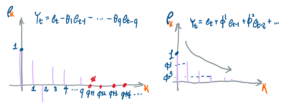 즉 q+1 이후 시차에선 두 확률변수간 선형상관관계가 나타나지 않음을 알 수 있다.