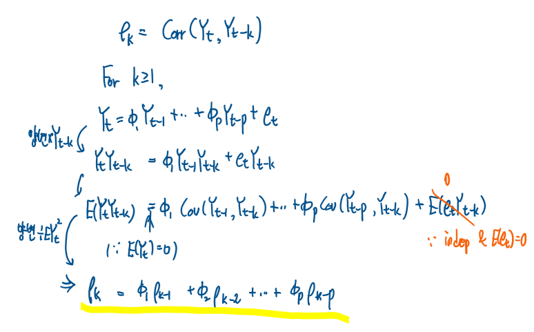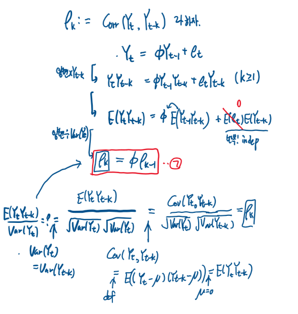 AR(1) 모형에선 두 확률변수의 시차가 클수록, 두 확률변수의 선형 상관관계는 지수적으로 감소함을 알 수 있다.