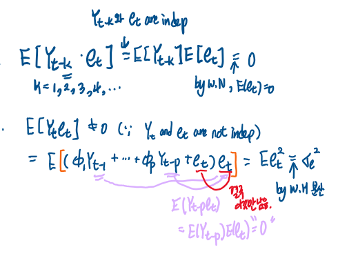직관적으로 왜그럴까 생각을 해보면 et는 t시점에 튀어나온 값이므로 t시점 이전의 확률변수들 Yt-1, Yt-2, ..은 et와 관련이 없다.