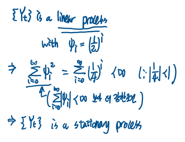 무한등비수열의 합공식을 이용한다면, 유한한 값을 얻게된다.( 왜냐면 현재 공비가 |1/2| < 1 이므로, 해당 무한등비수열의 합은 수렴한다) 즉 계수들의 절댓값의 합이 유한한 값을 가지므로, 해당 확률과정 {Yt}는 정상성을 갖는다.