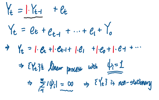 그리고 계수들의 절댓값의 합이 발산하므로, 해당 확률과정 {Yt}는 비정상성을 갖는다.