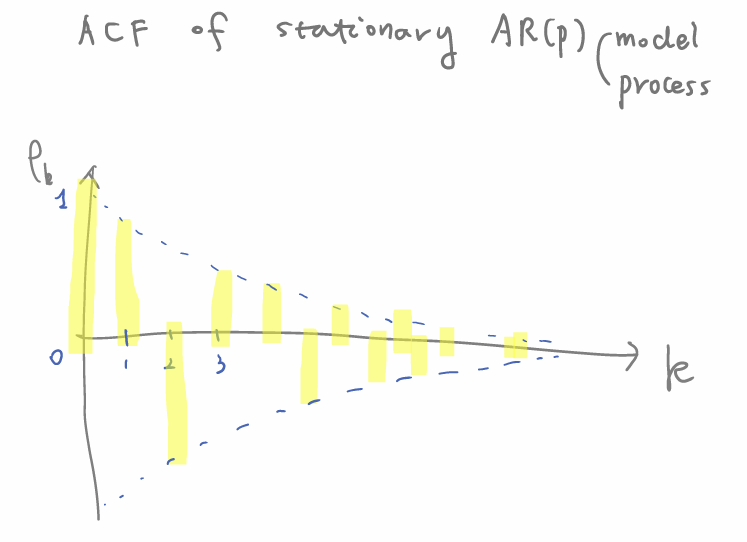 ACF of stationary AR(p)는 k가 커짐에 따라 ρk가 지수적으로 감소하는 형태를 가짐을 알 수 있다.