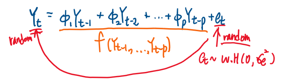 그러나 우리는 다음과 같은 f(Yt-1, ..., Yt-p)이라는 모형을 만들어도 이 모형(f)만으로 Yt을 설명할 수 없는 부분이