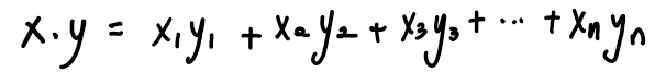 만일 두 벡터 x = ( x1, x2, x3, ... , xn) , y = (y1, y2, y2, .... , yn) 의 내적은 다음과 같다.