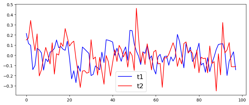 지금 해당 예제의 경우 , t1에 의해 t2가 Granger cause가 되는지? 확인하는 것이 목적이므로